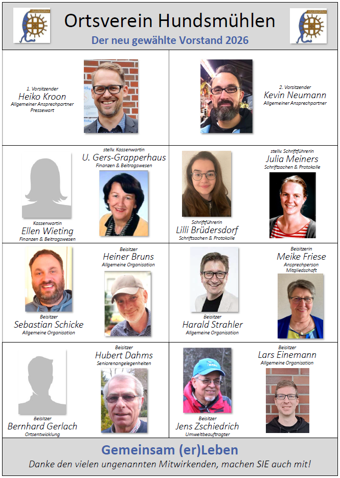 Die sich aus daraus ergebenden Aufgaben werden von dem „engeren“ Vorstand, bestehend aus dem 1. und 2. Vorsitzenden, dem Kassenwart und dem Schriftführer mit den jeweiligen Stellvertretern sowie bis zu 10 Beisitzern, von den Vertrauensleuten (aktuell 8) sowie von ehrenamtlichen Helfern aus der Bevölkerung wahrgenommen. Zur Betreuung der Einwohner ist Hundsmühlen in 12 Bezirke eingeteilt, denen jeweils ein/e Vertrauensmann/-frau vorsteht. Die Vertrauensleute nehmen regelmäßig an den dann „erweiterten“ Vorstandssitzungen teil.